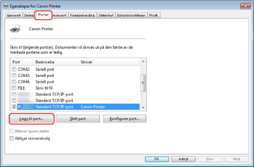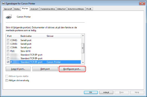 Dette forklarer prosedyren for å bytte porten som brukes av en enhet tilkoblet av et nettverk til en standard TCP/IP-port. Hvis du midlertidig tilordner en port til en enhet når du installerer driveren, kan du endre den til riktig port ved å følge denne prosedyren.