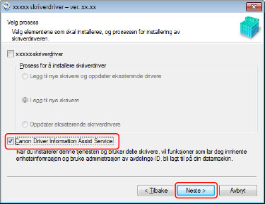 Dette forklarer prosedyren for installering av Canon Driver Information Assist Service for automatisk innstilling av funksjonen for innhenting av enhetsinformasjon. Følg denne prosedyren for å aktivere bruk av funksjonen for innhenting av enhetsinformasjon etter at driveren er installert.