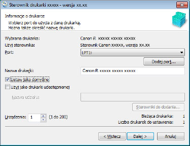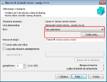 Jeżeli dodano lub wybrano port drukarki sieciowej, nie można ustawić opcji [Nazwa drukarki] ani [Użyj jako drukarki udostępnionej].