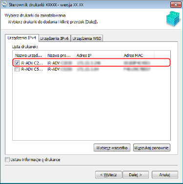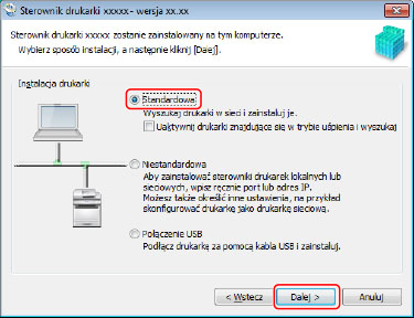 Ta procedura polega na automatycznym wyszukaniu urządzenia w sieci i zainstalowaniu sterownika ([Standardowa]).