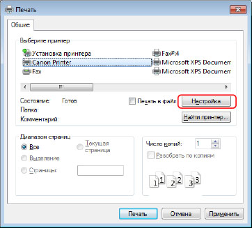 Выберите устройство → нажмите кнопку [Настройка], [Свойства принтера] или [Свойства].