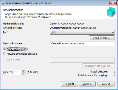 Om du har lagt till eller valt en nätverksskrivarport kan du inte ange [Namn på skrivare] och [Använd som delad skrivare].
