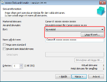 Ange en standard-TCP/IP-port eller en nätverksskrivarport. Du kan ange en port som redan är registrerad. Du kan välja en tillfällig port ([LPT1] osv.) och ställa in den när installationen är klar.