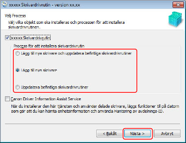 [Process för att installera skrivardrivrutin]: Välj detta vid behov om det redan finns en installerad drivrutin.