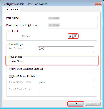 (1) Chọn [LPR] cho [Protocol] → chỉ định một trong các hàng chờ in cho [Queue Name] trong [LPR Settings].