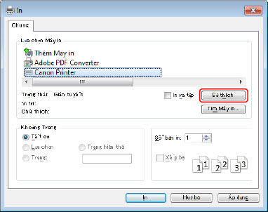 Chọn thiết bị → nhấp vào [Sở thích], [Thuộc tính Máy in], hoặc [Thuộc tính].