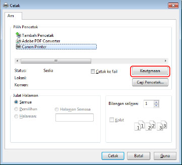 Pilih peranti → klik [Keutamaan], [Sifat Pencetak] atau [Sifat].