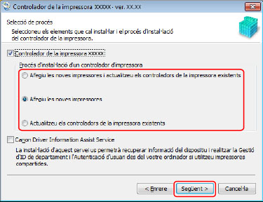 [Procés d'instal·lació d'un controlador d'impressora]: seleccioneu aquesta opció en cas necessari si ja s'ha instal·lat algun controlador.