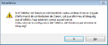 Si realitzeu la instal·lació amb el dispositiu connectat a través d'una xarxa, és possible que aparegui el quadre de diàleg següent. Si voleu utilitzar la funció de recuperació de la informació, seleccioneu [Sí]. Podreu utilitzar la funció de recuperació de la informació del dispositiu quan es desactivi el bloqueig del Tallafoc del Windows per al Canon Driver Information Assist Service.