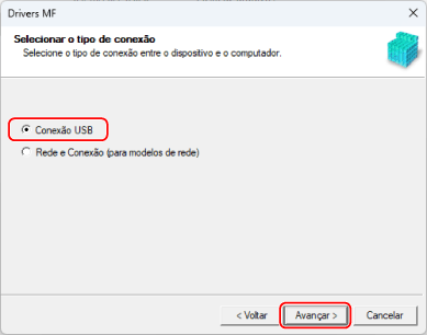 Se a seguinte tela for exibida. selecione [Conexão USB] → clique em [Avançar].