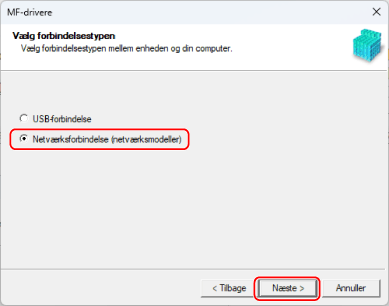 Hvis følgende skærmbillede vises, skal du vælge [Netværksforbindelse (netværksmodeller)] → klik på [Næste].