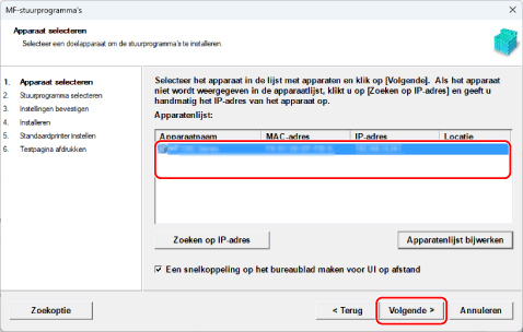 OPMERKINGAls het apparaat niet wordt weergegeven in [Apparatenlijst], controleer de verbindingstoestand dan tussen de computer en het apparaat en de instellingen van het IP-adres en klik op [Apparatenlijst bijwerken]. Als het apparaat nog steeds niet wordt weergegeven, klik dan op [Zoeken op IP-adres] → voer het IP-adres van het apparaat in → klik op [OK]. Raadpleeg de handleiding van het apparaat voor de IP-adresbevestigingsmethode.