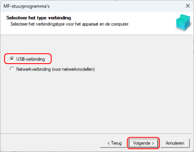 Als het volgende scherm wordt weergegeven, selecteer [USB-verbinding] → klik op [Volgende].