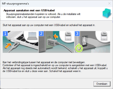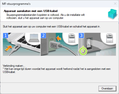 Sluit de USB-kabel aan volgens de instructies op het scherm. Als u de USB-kabel hebt aangesloten en geïnstalleerd, maak de USB-kabel dan los en installeer opnieuw. De USB-kabel wordt bovendien niet bij dit product meegeleverd. Deze moet u afzonderlijk voorzien.