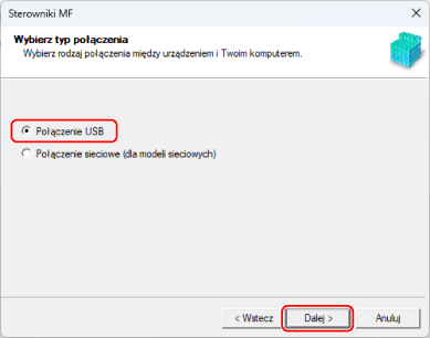 Jeśli wyświetlony zostanie następujący ekran, wybierz opcję [Połączenie USB] → kliknij przycisk [Dalej].