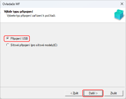 Pokud se zobrazí následující obrazovka, vyberte možnost [Připojení USB] → klikněte na tlačítko [Další].