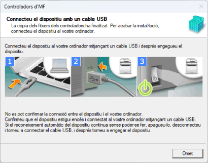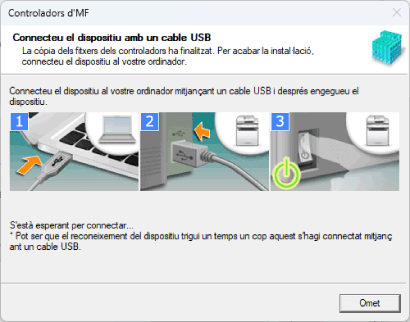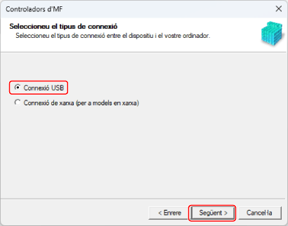 Si es mostra la pantalla següent, seleccioneu [Connexió USB] → feu clic a [Següent].
