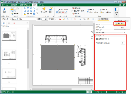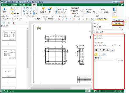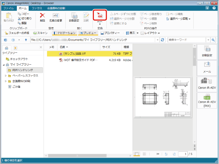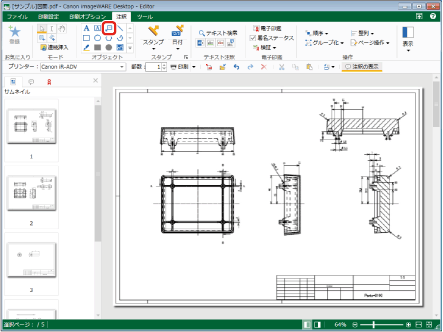「PDF文書への変換」で作成した「[サンプル] 図面.pdf」を選択して、[ホーム]タブの[ページ編集]をクリックします。ページ編集モードが起動します。