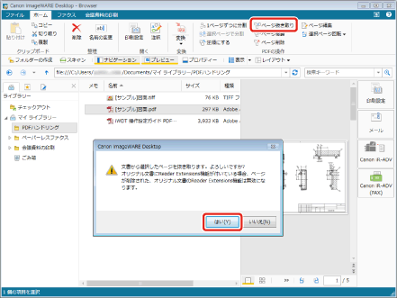 [ホーム]タブの[ページ抜き取り]をクリックし、表示されたダイアログボックスで[はい]をクリックします。抜き取られたページが同じ場所に保存されます。