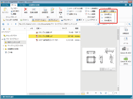 [ホーム]タブの[選択ページ回転]をクリックして、[左90度]、[180度]、または[右90度]を選択します。