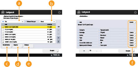<Detalls/Editar>Mostra els detalls del tipus de paper seleccionat a la pantalla <Detalls/Editar>. Si seleccioneu un tipus de paper personalitzat, el podeu editar.