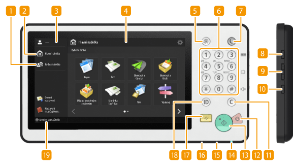 Když je třeba provádět autentizaci uživatele, stiskněte toto tlačítko, abyste se přihlásili do systému stroje. Po ukončení práce na stroji opětovným stisknutím tohoto tlačítka proveďte odhlášení ze systému stroje.