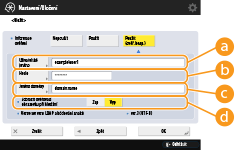 Příklad: Když je jméno domény Windows „priklad“ a uživatelské jméno Windows je „uzivatel1“, zadejte „priklad\uzivatel1“. Když používáte Lotus Notes Domino, zadejte zavedený název ověřovaného uživatele (dn), například „cn=user1,ou=team1,ou=salesdept,o=canon“.