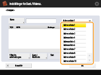 (e-mail), (fax), (I-fax) eller (fil) for at filtrere de modtagere, der vises i adresselisten ( ). Tryk på <Alle> for at vise alle registrerede modtagere. ModtagerModtagere, der er registreret i adresselisten, du valgte i trin 6, vises. Vælg på denne liste de modtagere, du vil registrere i en gruppe.