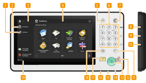 Druk hierop om veel instellingen voor de machine op te geven, zoals <Voorkeuren> of <Stel bestemming in>.