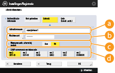 <Weergave auth. scherm bij zoeken>Om bij het zoeken naar bestemmingen de gebruikersnaam en het wachtwoord weer te geven in het invoerscherm, drukt u op <Aan>.