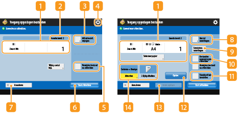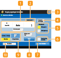 Geeft instellingenstatus weer, zoals het papierformaat om op af te drukken en het aantal afdrukken. Controleer de instellingen om goed te kunnen afdrukken. Om de instellingen te wijzigen, drukt u op de knop onder het weergavegedeelte. Om het aantal afdrukken te wijzigen, voert u met de numerieke toetsen het aantal in.