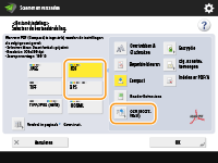 Als u als bestandsindeling <PDF> of <XPS> selecteert, kunt u <Compact> en <OCR (Doorzoekbare tekst)> tegelijk instellen. In dat geval wordt <PDF (Compact)> of <XPS (Compact)> weergegeven als bestandsindeling op het scherm met basisfuncties voor scannen en verzenden.