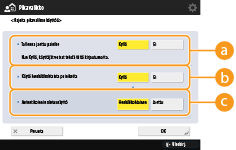Jos asetuksena on <Kyllä>, kaikki käyttäjät voivat tallentaa/muokata jaettuja painikkeita. Jos asetuksena on <Ei>, toimintoja ei voi käyttää, ellei käyttäjä ole kirjautunut sisään pääkäyttäjänä.