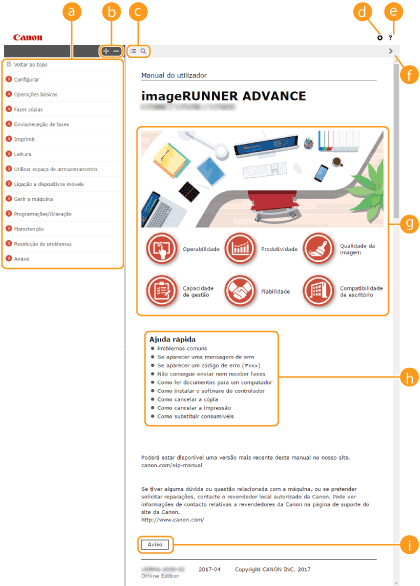 Clique para visualizar informações sobre como ver o Manual do utilizador, como efetuar uma procura e outras informações.