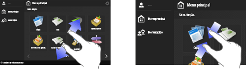 Utilizar da mesma forma que um smartphone (deslizar/aproximar e afastar dedos)Em alguns ecrãs, como o Menu principal e o Menu rápido, pode mudar de página ou deslocar-se deslizando o dedo para cima/baixo ou para a esquerda/direita no ecrã, tal como faria com um smartphone.