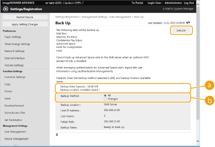 A cópia de segurança ou reposição dos dados gravados pode demorar algum tempo. Não desligue a máquina enquanto o processo de cópia de segurança ou reposição não for concluído. Tal pode fazer com que a máquina funcione incorretamente.