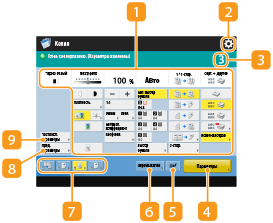 В этой области представлены сведения о состоянии параметра, такие как коэффициент масштабирования, формат бумаги, количество копий и т. д. Чтобы копирование было выполнено должным образом, обязательно проверяйте параметры в этом разделе экрана. Для изменения значений нажмите кнопку, расположенную под этой областью.