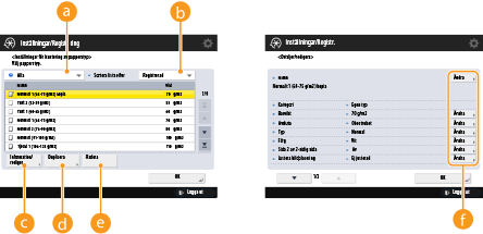 <Information/redigera>Visar uppgifterna om den valda papperstypen i skärmen <Information/redigera>. Om du väljer en egen papperstyp kan du redigera den.