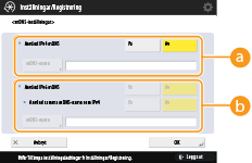 ![]() Om du sätter <Använd DHCPv6> till <På> i inställningarna för tillståndsstyrd adress (Ange en IPv6-adress), skrivs de manuellt konfigurerade domännamnen över. Om du sätter <Använd samma värd-/domännamn som IPv4> till <På>, används det domännamn som hämtas från DHCPv6-servern.