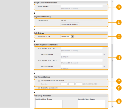 <Hanteringsinställningar> <Användarhantering> <Hantera autentisering> <Registrera/redigera autentiseringsanvändare>. <Registrera/redigera autentiseringsanvändare>Skapa användargrupperAdresslistor i adressboken kan delas mellan användare som är registrerade i en användargrupp. Registrera användargrupper