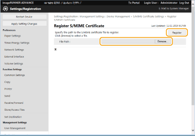Klicka på [Browse...], ange vilken fil (S/MIME-certifikat) som ska registreras och klicka på [Register].