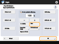 När skärmen för att välja originalets format visasOm <Välj papper> är inställt på <Auto> kanske skärmen för att välja originalets format visas. Den visas eftersom originalets format inte kan verifieras och papper inte kan väljas automatiskt när original av hög transparens, original med extremt mörk bakgrundsfärg eller liten storlek har placerats. Välj originalets format eller ett så bra överensstämmande format som möjligt.