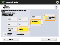 Om du väljer <PDF> eller <XPS> som filformat, kan du ange <Kompakt> och <OCR (sökbar text)> samtidigt. I detta fall visas <PDF (Kompakt)> eller <XPS (Kompakt)> som filformat i skärmbilden för grundläggande funktioner för scanna och skicka.