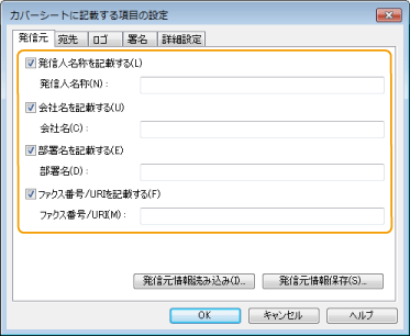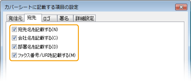 宛先情報として必要な項目にチェックマークを付け、内容を入力します。宛先名、会社名、部署名、ファクス番号は[宛先選択]/[宛先入力]タブで入力した内容(