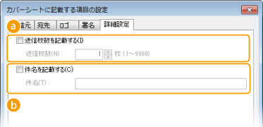 [送信枚数を記載する]カバーシートに送信枚数を記載したい場合はチェックマークを付け、送信枚数を[送信枚数]に入力します。送信枚数は自動で計算されません。ここで入力した値がカバーシートに記載されます。