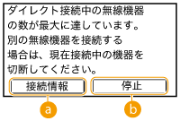 ダイレクト接続中、お使いのモバイル機器によってはインターネットに接続できないことがあります。 ダイレクト接続中に<任意のSSIDを使用>が<OFF>の場合、同時に2台以上の接続はできません。 SSIDとネットワークキーを表示中に、モバイル機器から5分以内に無線接続を行わなかった場合、接続待機状態が終了します。 ダイレクト接続で通信中、本機とモバイル機器とでデータの送受信が無い状態が続くと、通信が終了する場合があります。 本機のSSIDとネットワークキーはダイレクト接続の都度変更されます。 ダイレクト接続中はスリープモードの節電効果が下がります。 ダイレクト接続を利用する場合、モバイル機器側でIPアドレスを手動で設定しないでください。設定を行うと、ダイレクト接続利用後に通信が正しく行えなくなることがあります。 |