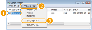 リモートUIから中止するリモートUIの[ジョブ状況]ページから印刷を中止することができます。印刷文書の状況を確認する アプリケーションから中止するアプリケーションによっては、印刷中に次のような画面が表示されます。[キャンセル]をクリックして印刷を中止することができます。 ![]() |