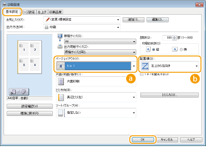 各ページをどのような配置で1枚の用紙に収めるかを設定することができます。たとえば、[左上から右向き]という設定を選択した場合は、最初のページは左上に配置され、そのあとは右方向に順に配置されます。