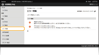 エラーが発生しているとき、ポータルページ(メイン画面)の[エラー情報]に表示されているメッセージをクリックすると、このページが表示されます。