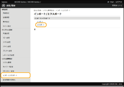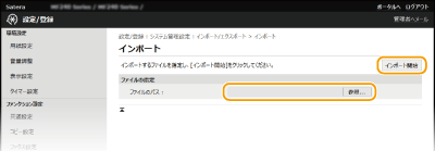 インポートやエクスポートが完了するまでは電源を切らない処理が完了するまで数分かかることがあります。処理中に電源を切ると、データが破損したり、本機が故障したりする恐れがあります。 インポート中やエクスポート中は本機の操作をしないインポートやエクスポートをする前に、本機が印刷やコピーなどの処理中でないことを確認してください。 |